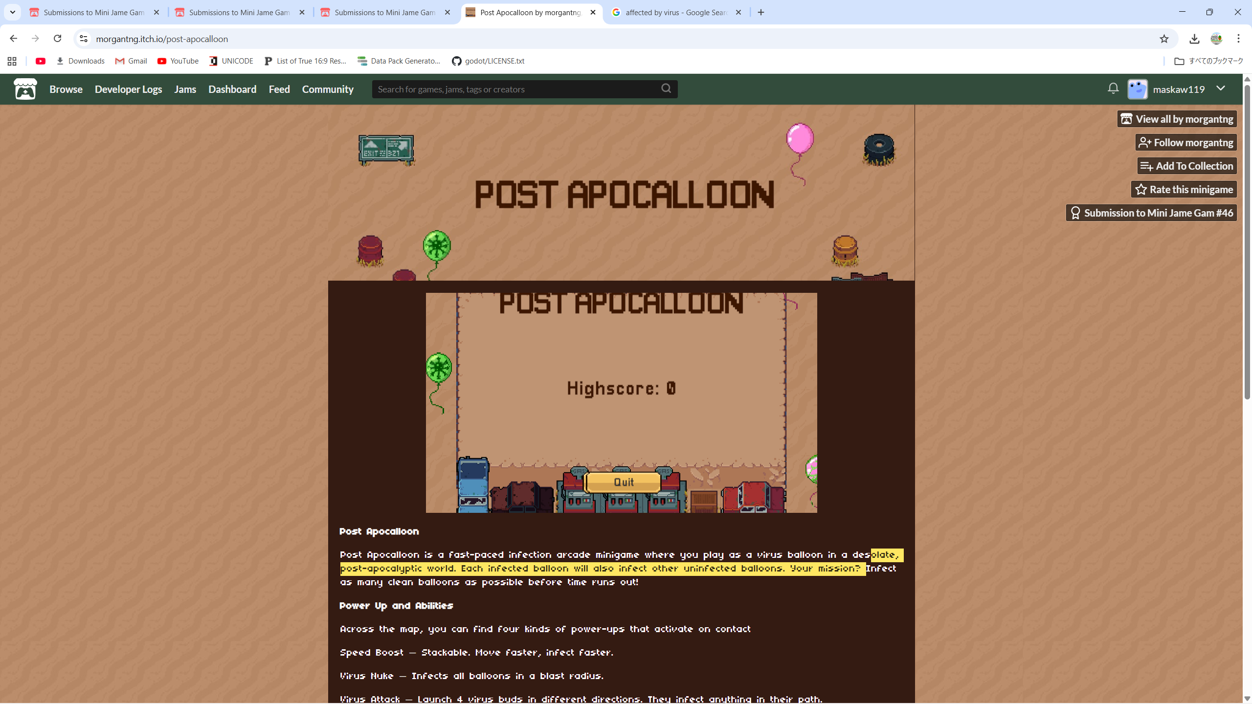 Post Apocalloon is a fast-paced infection arcade minigame where you play as a virus balloon in a desolate, post-apocalyptic world. Each infected balloon will also infect other uninfected balloons. Your mission? Infect as many clean balloons as possible before time runs out!